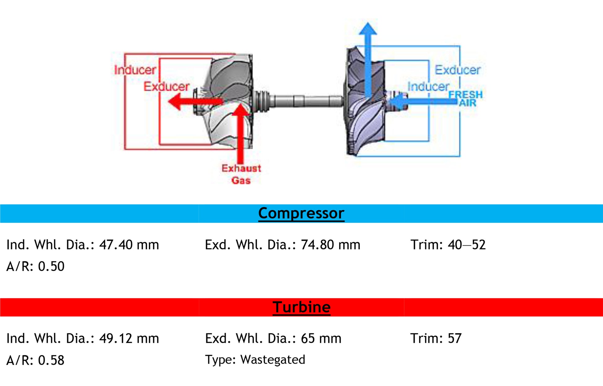 Rueda del compresor: (Ind. 47,40 mm, Exd. 74,80 mm, Trim 40-52)