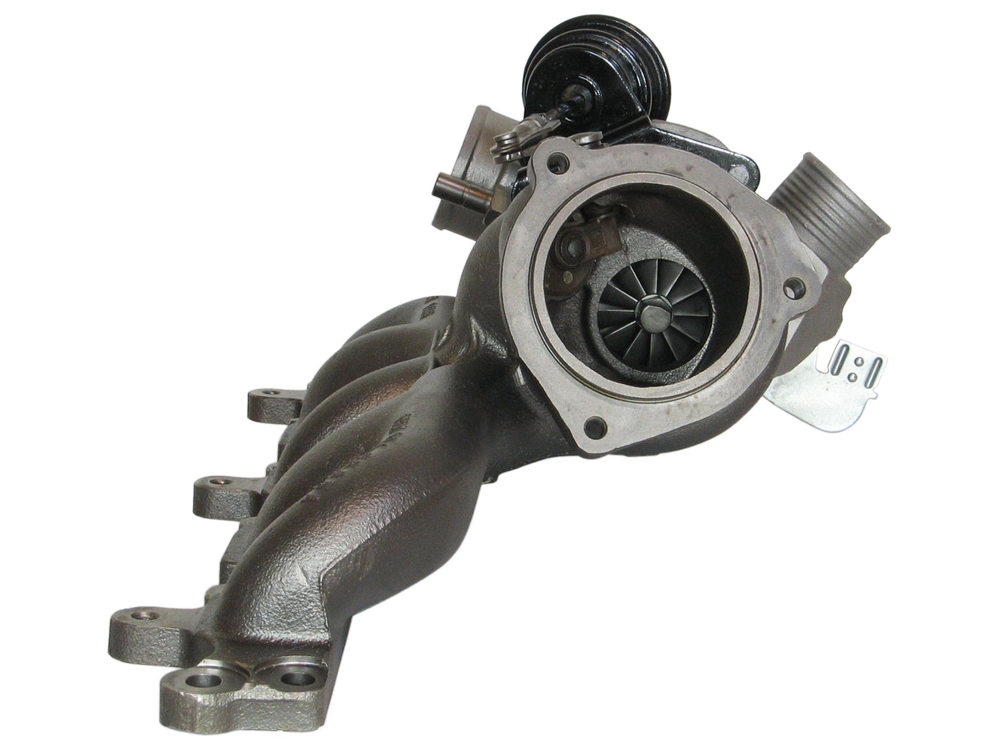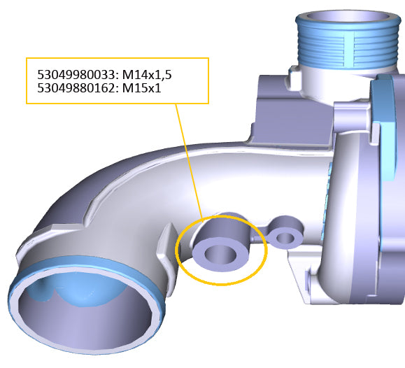 NOTE: Intercooler, integrated manifold, water cooled bearing housing. 53049880162 is almost identical with 53049980033 except for the thread size of the indicated port in the compressor housing and the hose arrangement around the boost control solenoid valve.