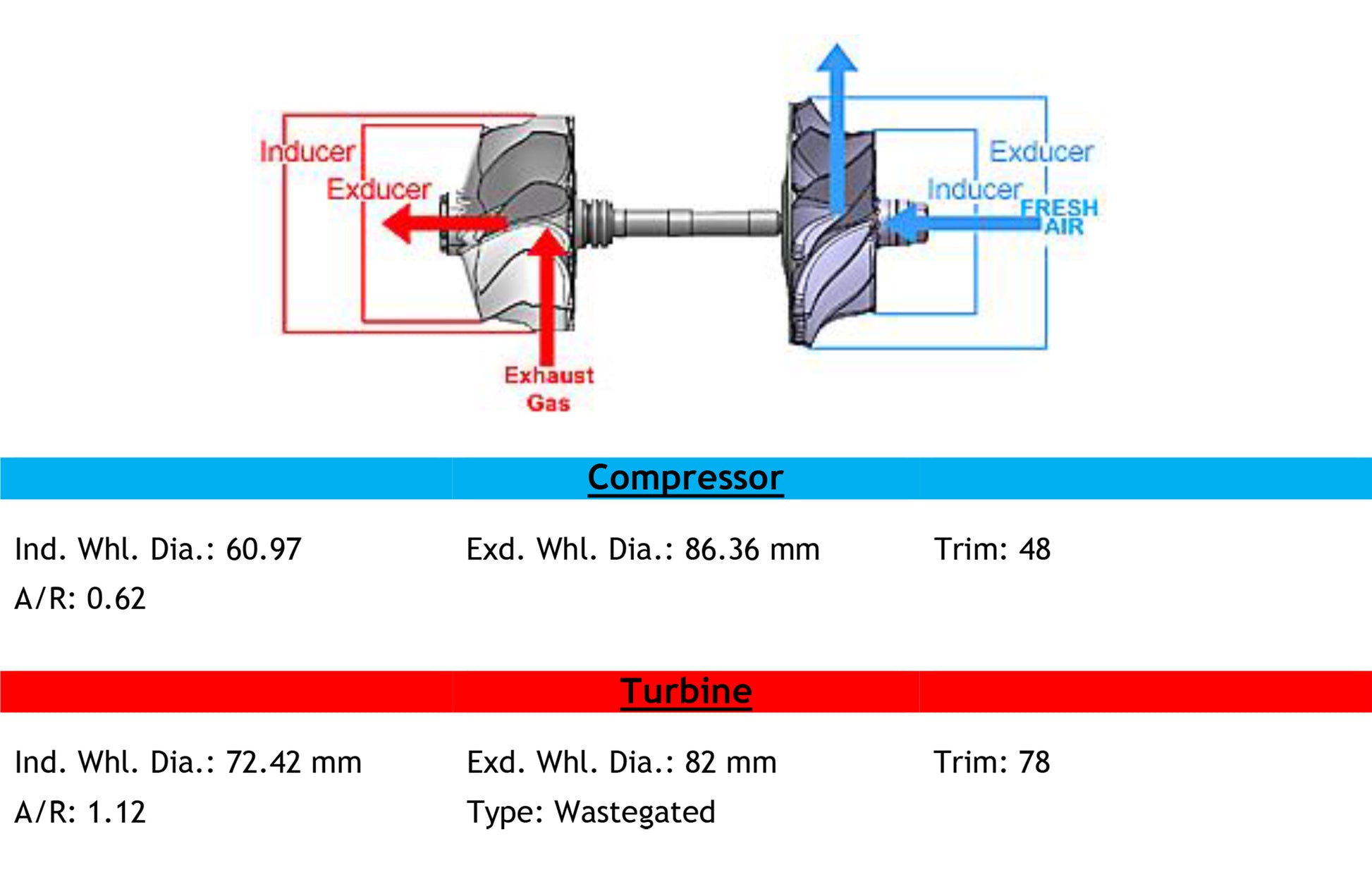 Turbine Wheel: (Ind. 72.42 mm, Exd. 82 mm, Trim 78)