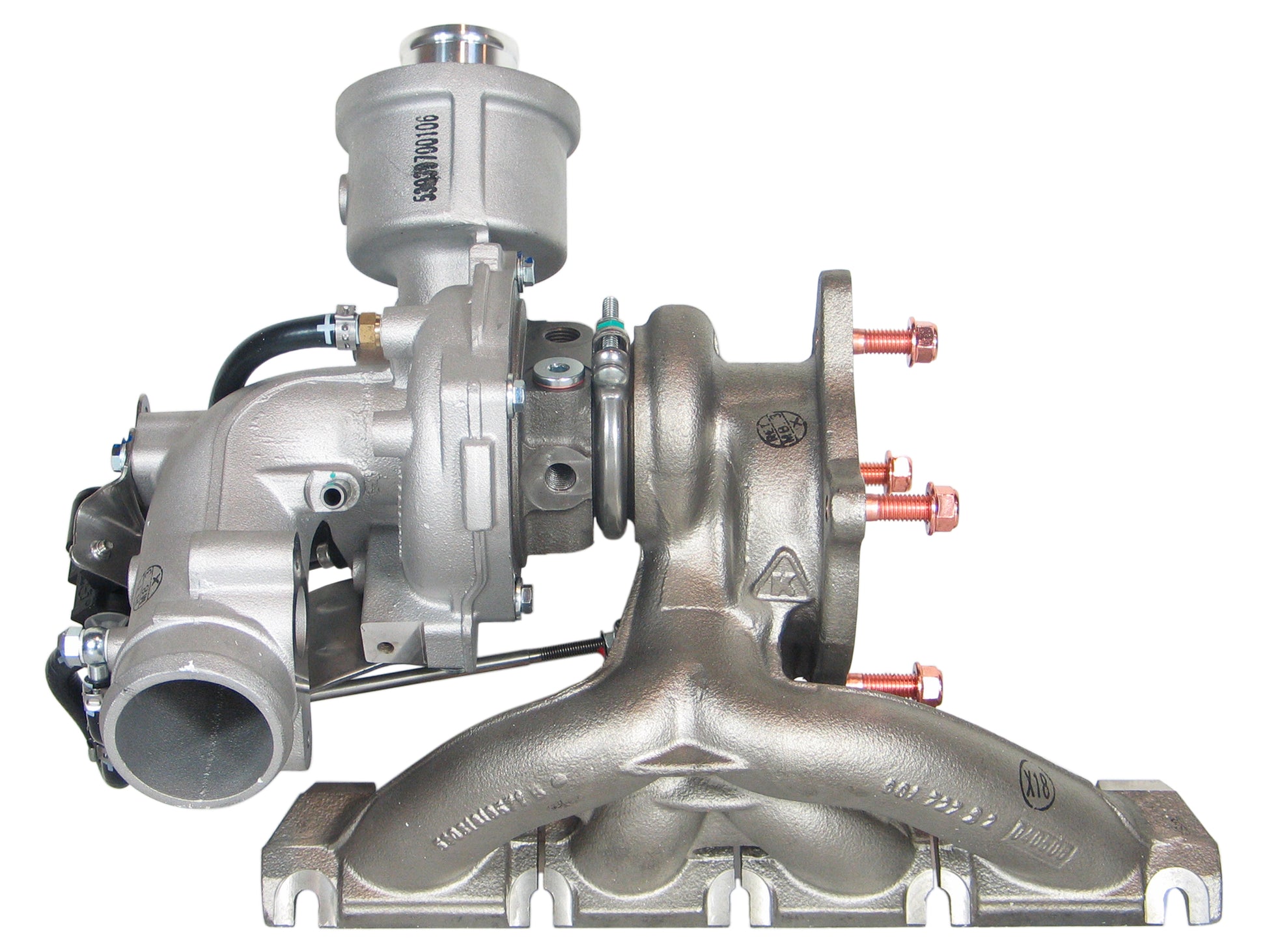 NOTE: Intercooler, integrated manifold, water cooled bearing housing.